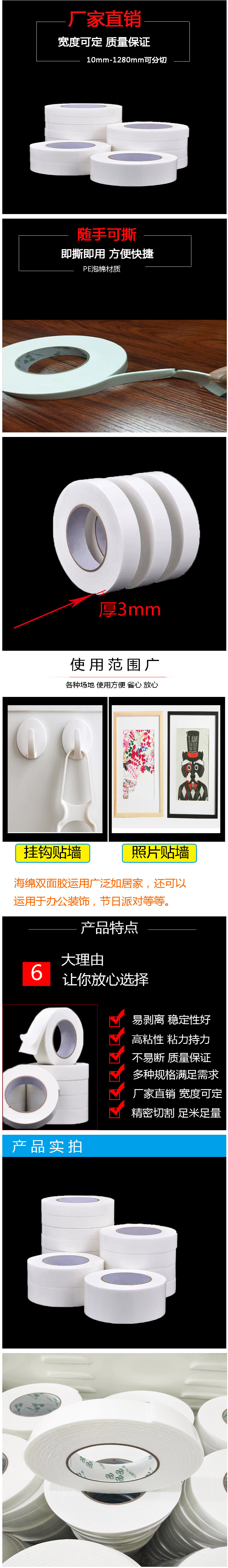 泡棉雙面膠是指在發(fā)泡泡棉基材兩面涂上強(qiáng)粘丙烯酸膠粘劑,然后一面覆上離型紙或離型膜而成的一種雙面膠,如果兩面都覆上離型紙或離型膜稱之為夾心雙面膠紙,做成夾心雙面膠主要是為了方便雙面膠沖型。泡棉雙面膠具有粘著力強(qiáng)、保持力佳、防水性能好、耐溫性強(qiáng)、防紫外線能力強(qiáng)的特性。發(fā)泡泡棉基材分為:EVA泡棉、PE泡棉、PU泡棉、壓克力泡棉及高發(fā)泡。膠系分為:油膠、熱溶膠、橡膠及壓克力膠。