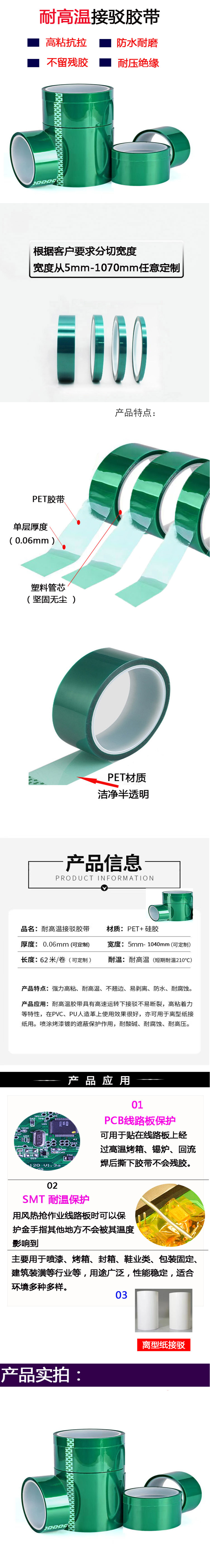 耐高溫膠帶具有高速運轉(zhuǎn)下接駁不易斷裂,高粘著力等特性,在PVC、 PU人造革上使用效果很好,亦可用于離型紙接紙用。噴涂烤漆鍍的遮蔽保護(hù)作用,耐酸堿、耐腐蝕、耐高壓。